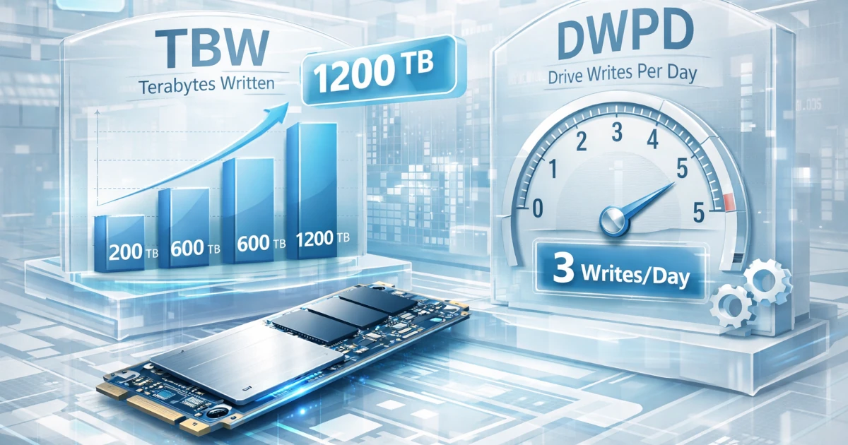 TBW (Total Bytes Written) — лимит суммарной записи за срок жизни по оценке производителя, обычно привязанный к гарантийным условиям. DWPD (Drive Writes Per Day) — удобный формат для сценариев, где важна ежедневная запись: сколько “полных перезаписей” накопителя допускается в сутки в рамках гарантии.